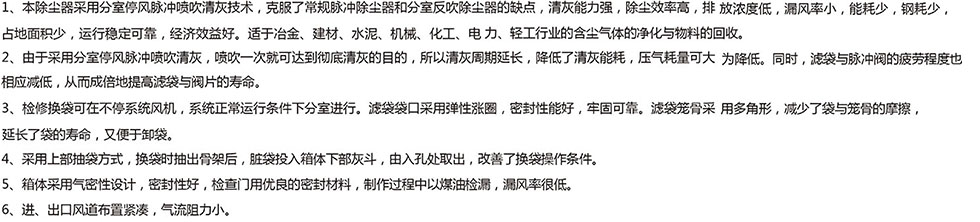 含塵氣體由進氣口進入灰斗、或通過敞開法蘭口進入濾袋室,含塵氣體通過除塵器濾袋過濾為凈化氣體進入凈氣室,再經(jīng)凈氣室排氣口,由風(fēng)機排走。粉塵積附在濾袋的外表面,且不斷增加,使袋式除塵器的阻力不斷上升,為使設(shè)備阻力不超過1200Pa,袋除塵器能繼續(xù)工作,需定期清除濾袋上的粉塵,清灰是由PLC程序控制器定時順序起啟動脈沖閥,使氣包內(nèi)壓縮空氣(0.5-0.7Mpa)由噴吹管噴出(稱一次風(fēng))通過文氏管誘導(dǎo)數(shù)倍于一次風(fēng)的周圍空氣(稱二次風(fēng))進入濾袋使濾袋在瞬間急速膨脹,并伴隨著氣流的反向作用力抖落粉塵,達到清灰的目的。