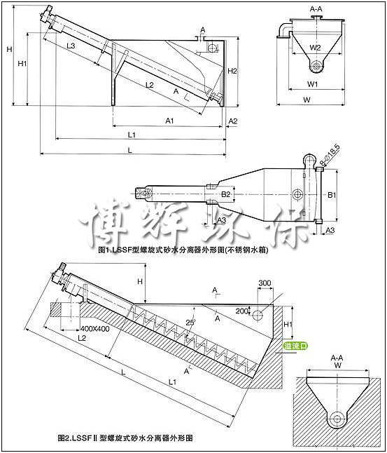 螺旋砂水分離器由驅動裝置、螺旋體、水箱、U形槽、襯條等部件組成。砂水分離機本體由砂水分離槽和螺旋輸砂槽組成。水槽的大分離流量和螺旋輸砂能力分離槽內停留時間>2min,并具有足夠的余量。