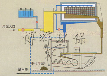 通過污泥變流量泵泥漿先進入混凝給料系統,同時釋放后的絮凝劑在變流量藥劑泵的作用下也進入系統內然后通過管式水中造粒使污泥與絮凝劑進行充分混合,根據污泥性能調節絮凝劑和污泥混合比,使污泥達到好的凝聚狀態,然后進入帶式濃縮機,在快速排水機構的作用下,大量的水快速通過網帶被濾除,濃縮后的污泥被卸泥裝置下到脫水機上重力脫水段,大部分游離水在重力作用下通過網帶被濾除,因游離水的分離網帶快速被自由狀污泥覆蓋,上層形成“水池”現象,同時網帶向前運行將污泥翻轉至下網帶重力脫水段,“水池”被翻轉到下網帶,在重力作用下將原形成的“水池”通過網帶被濾除,隨著網帶的運行污泥進入揳形預壓脫水段,污泥在“揳”性擠壓段中一方面使污泥平整,另一方面污泥受到輕度擠壓開始進行預壓脫水。接著進入S形壓力脫水段,污泥在S形壓力脫水段中被夾在上、下兩層濾帶中間經若干個由大到小的輥筒反復擠壓剪切。污泥在擠壓力和剪切力作用下逐步脫水,形成濾餅。接著通過卸料裝置將濾餅從濾帶上剝離下來,用大于0.5MPa的清水對各濾帶進行自動清洗達到濾帶再生目的。整個污泥脫水工作全部完成。該設備為24小時連續運行。