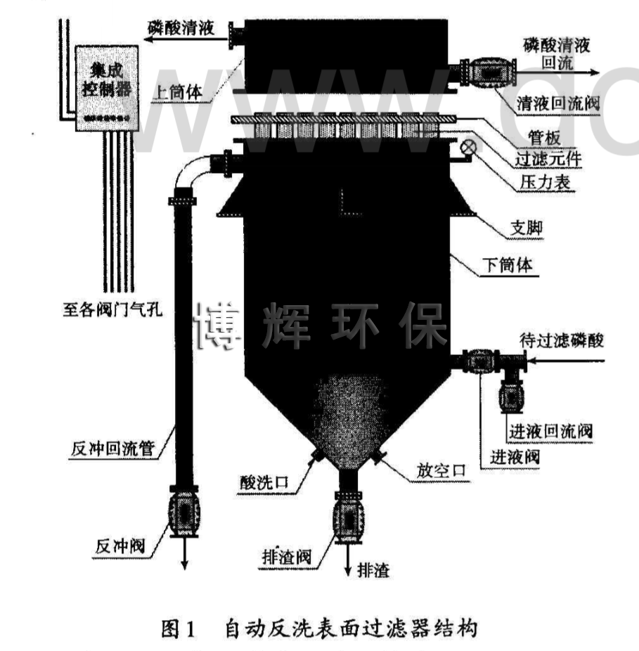 自動反洗表面過濾器由上桶體、下桶體、過濾元件、花板、氣控閥門、控制器及相關配管組成,將過濾系統、反洗系統、排渣系統、自動控制系統合理地結合為一體。